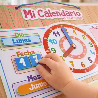 Un calendario magnético diseñado para que los niños comprendan el paso del tiempo de forma natural y divertida. Con piezas móviles y reloj de agujas, podrán interactuar cada día mientras desarrollan hábitos y autonomía.